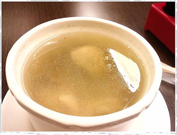 清燉雞肉湯,這道湯是我上次來吃的遺珠,今天終於有機會喝到了,湯裡面有四塊雞肉,大概就是一隻雞翅切成四塊的大小,整體還不錯,是以後來我會再點的東西之一。本來想再多點一碗湯,結果店裡的人非常中肯的建議我們不要,因為要再照順序排隊,會等很久。