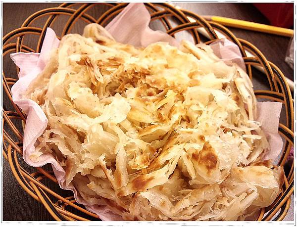 終於,在我餓到要啃桌子的時候,烙餅送上來了,這是我自己很喜歡的一道,有淡淡的麵粉香味,R說有加豬油,我是吃不出來,但確實吃到後來有點油。