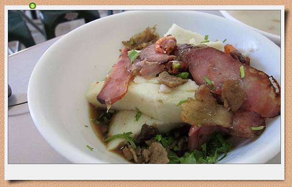 粿,沒有什麼味道,要靠其它東西來提味,相當軟嫩,頗像豆腐,只是又沒有豆腐那麼軟。