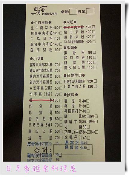 菜單,剛看到菜單還真有點驚訝,大部份的餐點價格都比一般專賣越南河粉的店高數十元左右。