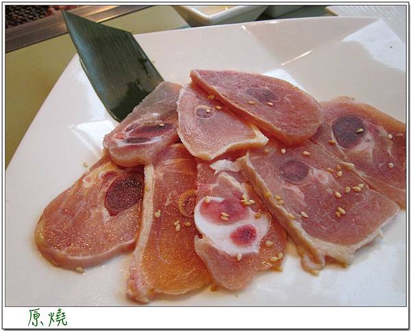 在服務人員來測試炭火的溫度夠了以後,主餐就送來了,然後幫我們烤了兩塊豬肉,提醒我們因為肉片熟了後會捲起來,所以要記得壓平受熱才會均勻,不過當自己烤的時候發現功力真的是差人家很多啊!