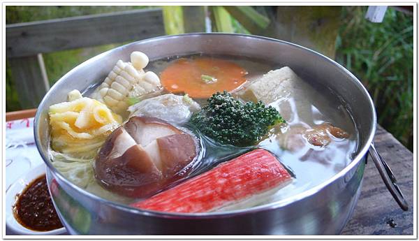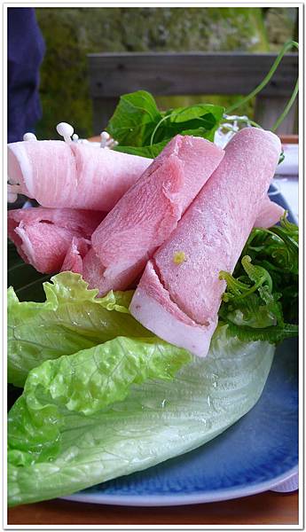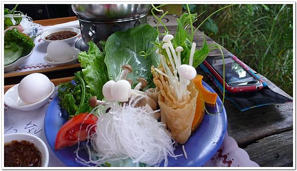 嗯,我的鍋要價340元,看到這個菜盤我更空虛了.............不過在山上也不能要求太多吧(笑),至少兩個火鍋的口味都還不錯,雞腿的份量也不算少,菜盤裡除了一般會出現在鍋裡的青菜之外,還多了比較少會拿來煮火鍋的過貓。